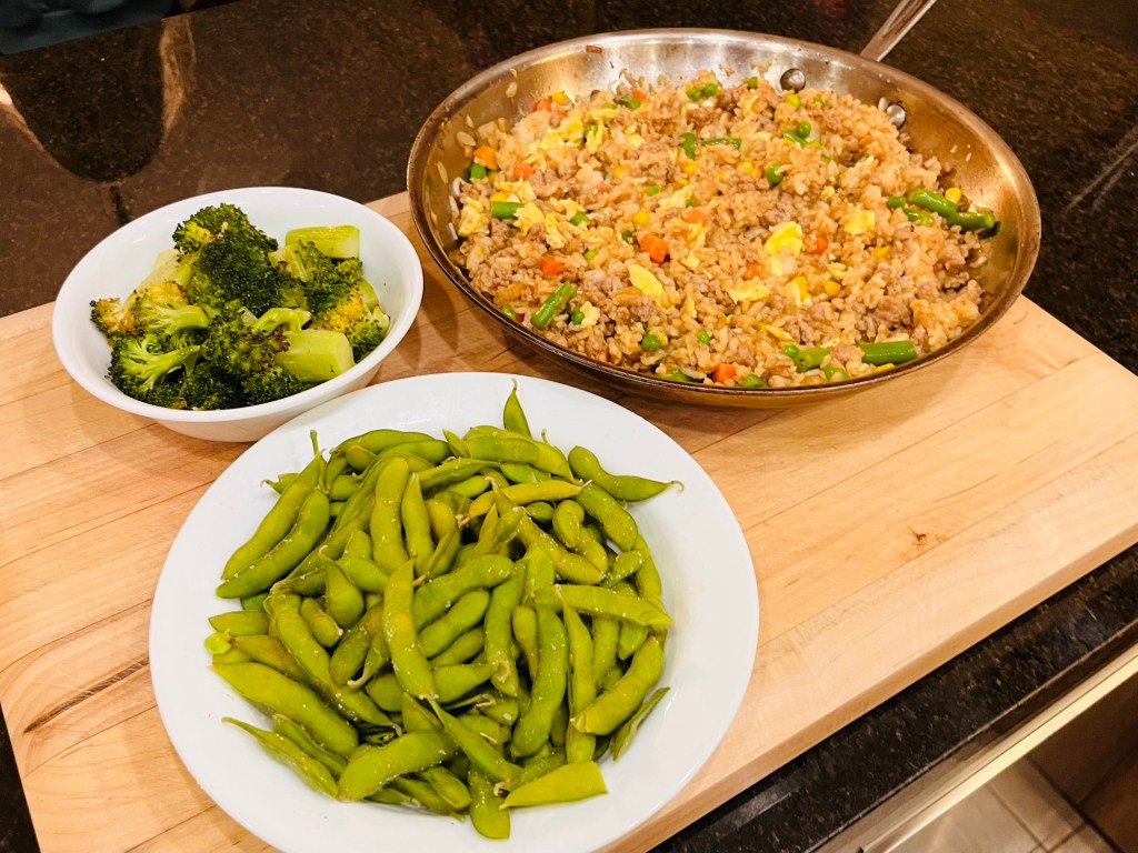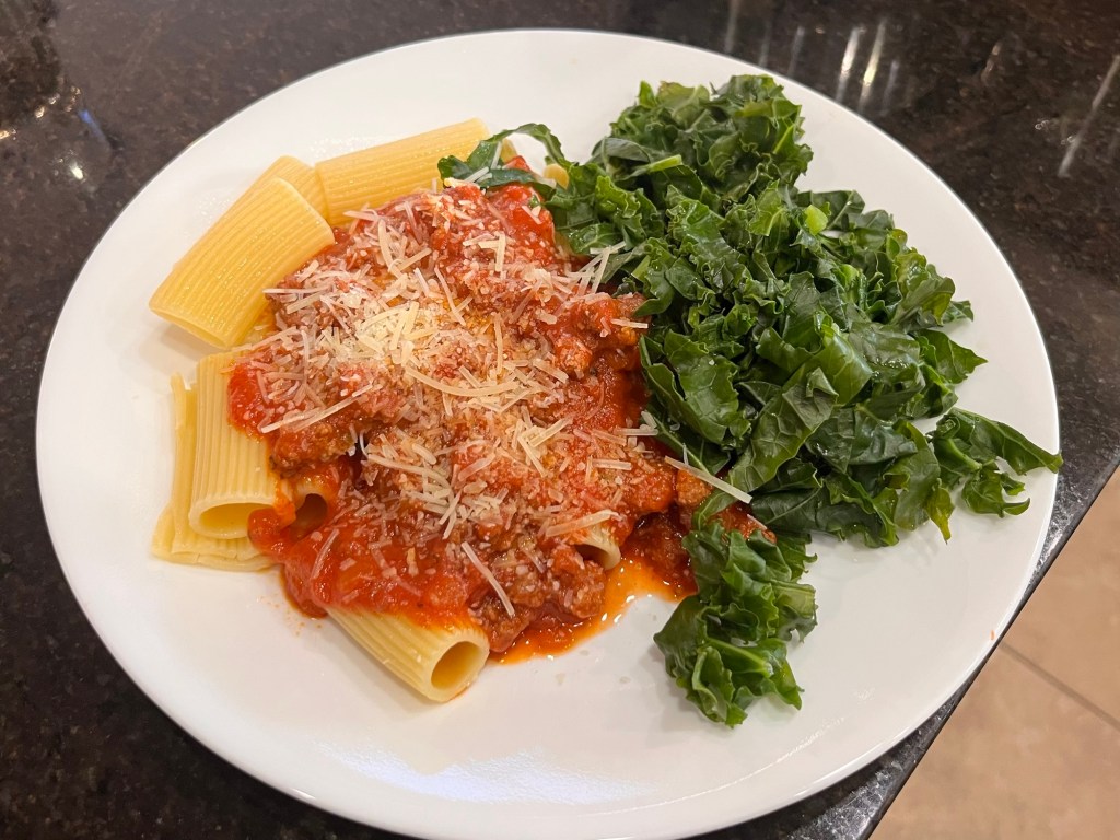 Pasta with hamburger cooked in sauce and steamed kale. We had an orchestra concert to get to for our little violinist and this was about all we had time for.