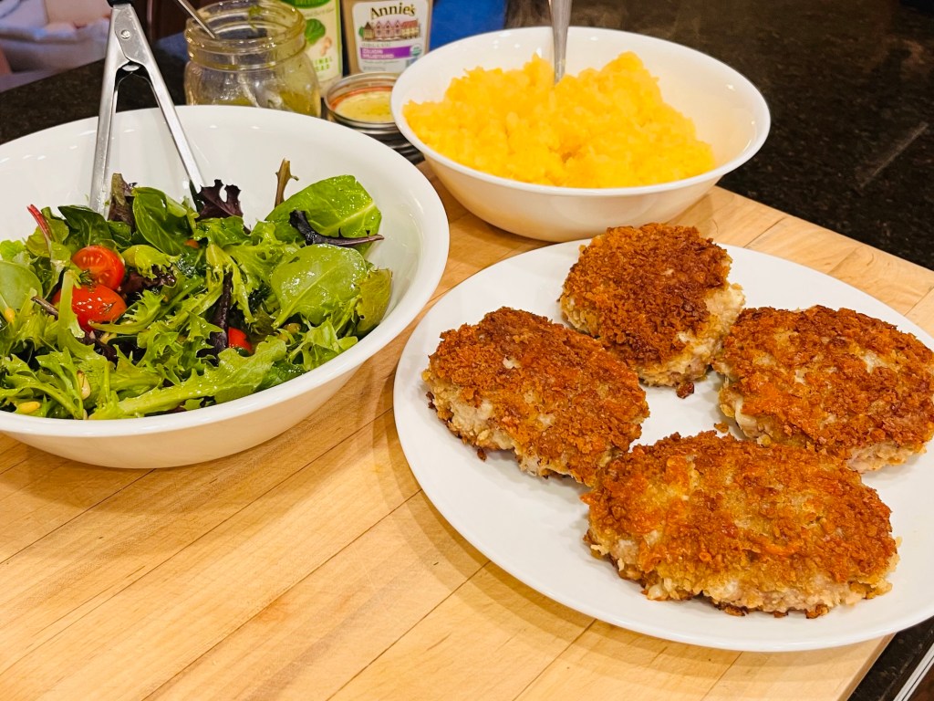 We’ve been making this easy turkey burger recipe for years and they’re always a crowd pleaser. In addition to adding the 1 cup of panko to the turkey mix, I also like to sprinkle additional panko on a plate and press both sides of each patty into the panko to ensure an extra crispy crust. We usually eat ours without the bun dipped in Dijon mustard or Ranch dressing. We ate our turkey burgers with Mashed Rutabagas and salad before racing out the door for evening activities.